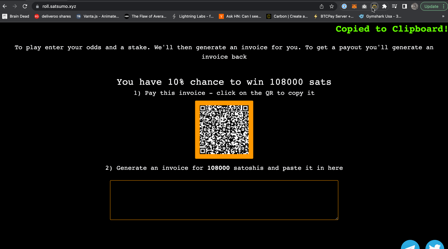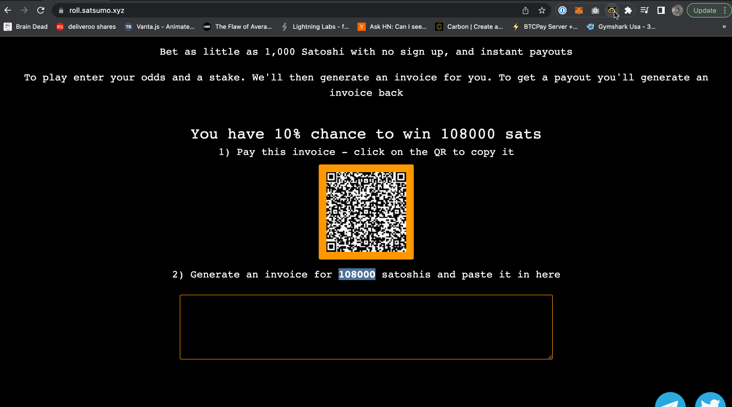 Type in the amount of sats you could potentially win. This will appear on the line below the QR code in Satsumo